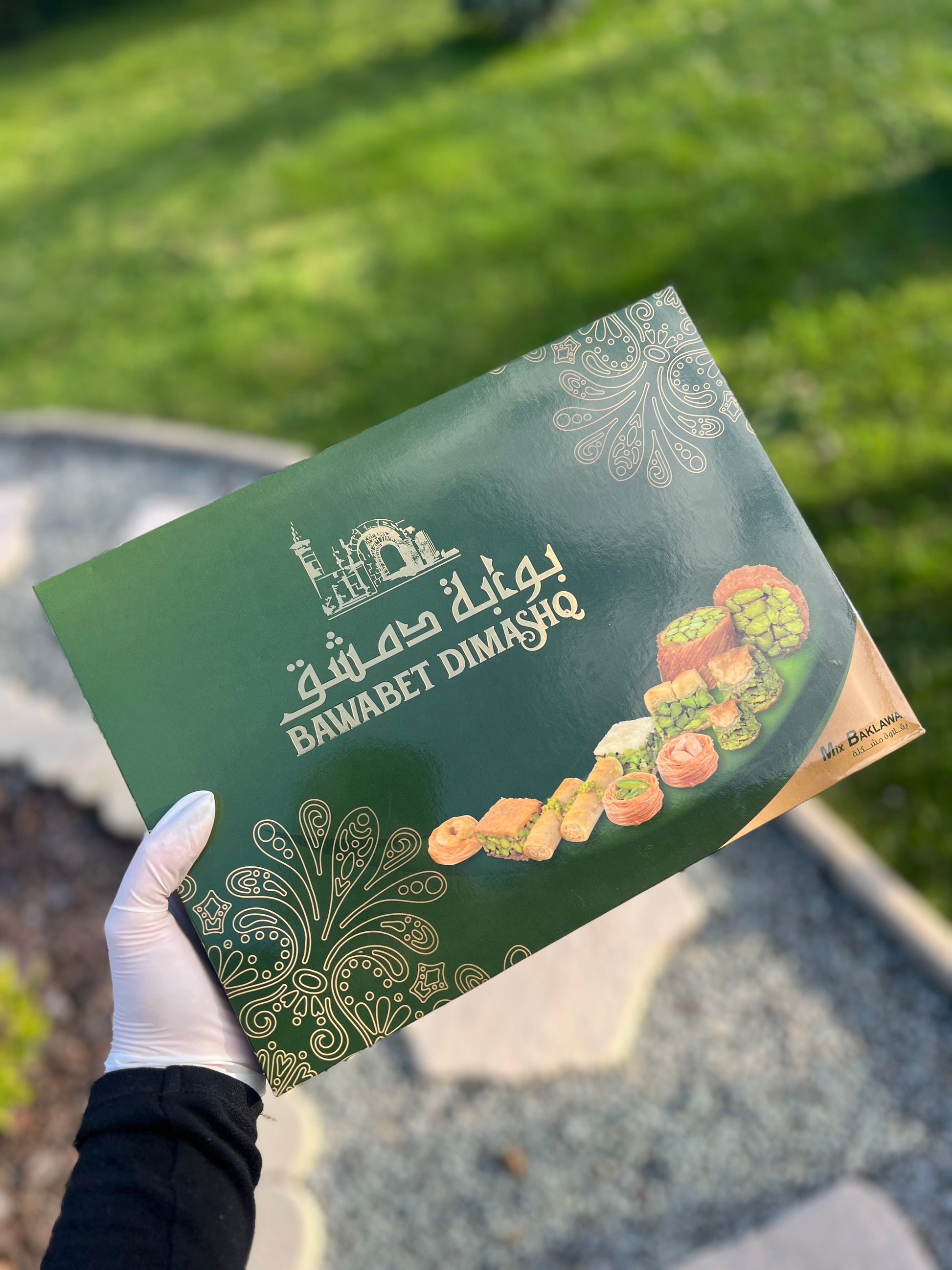 Un coffret raffiné signé Bawabet Dimashq, réunissant un assortiment de baklavas croustillantes garnies de pistaches de première qualité.