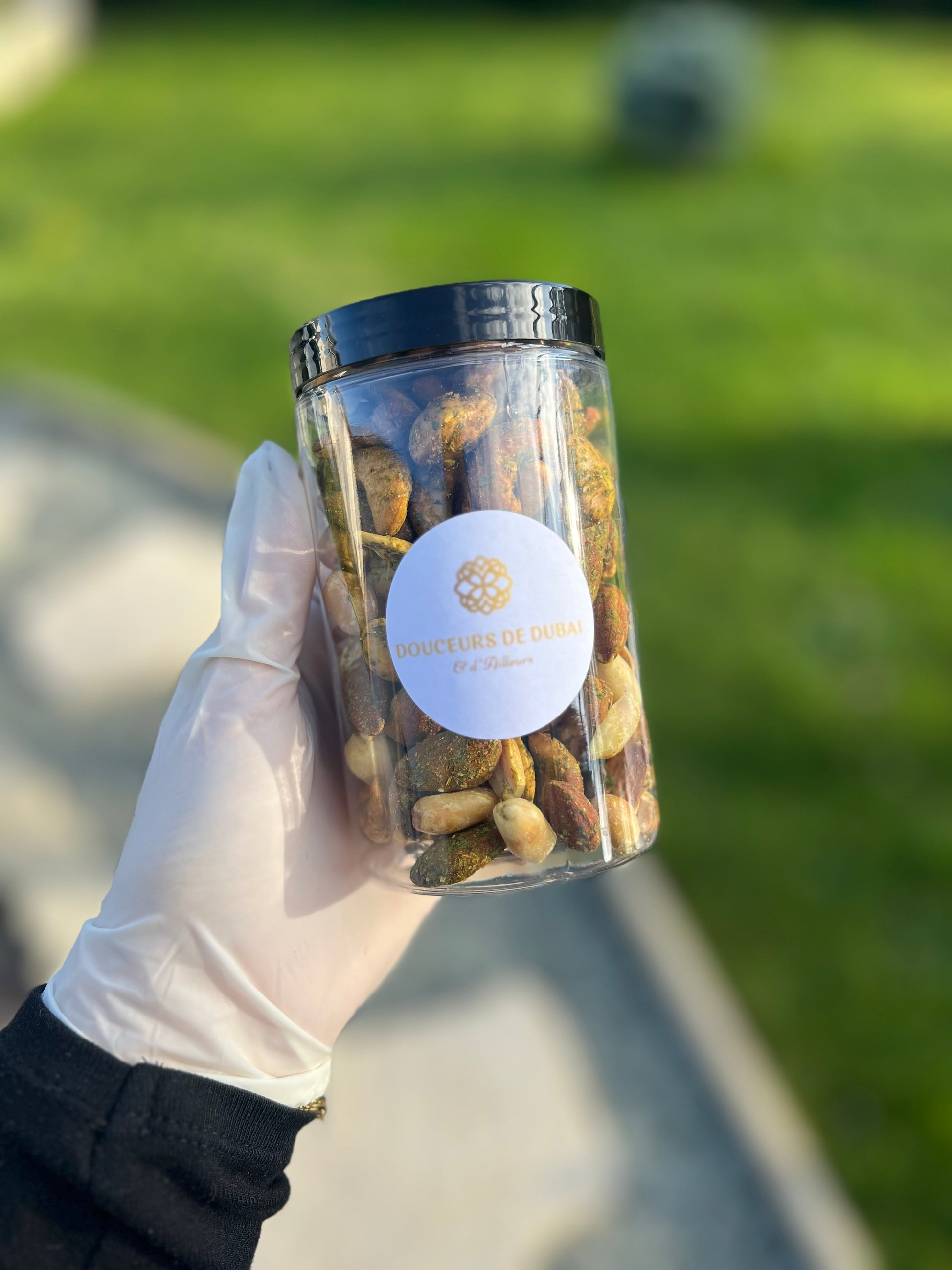 Découvrez l’alliance exotique et gourmande de nos noix de cajou fondantes, amandes croquantes et arachides grillées, subtilement relevées par le gingembre piquant, le curry parfumé et la douceur de la noix de coco. Chaque bouchée offre un équilibre parfait entre croquant, chaleur épicée et douceur exotique.