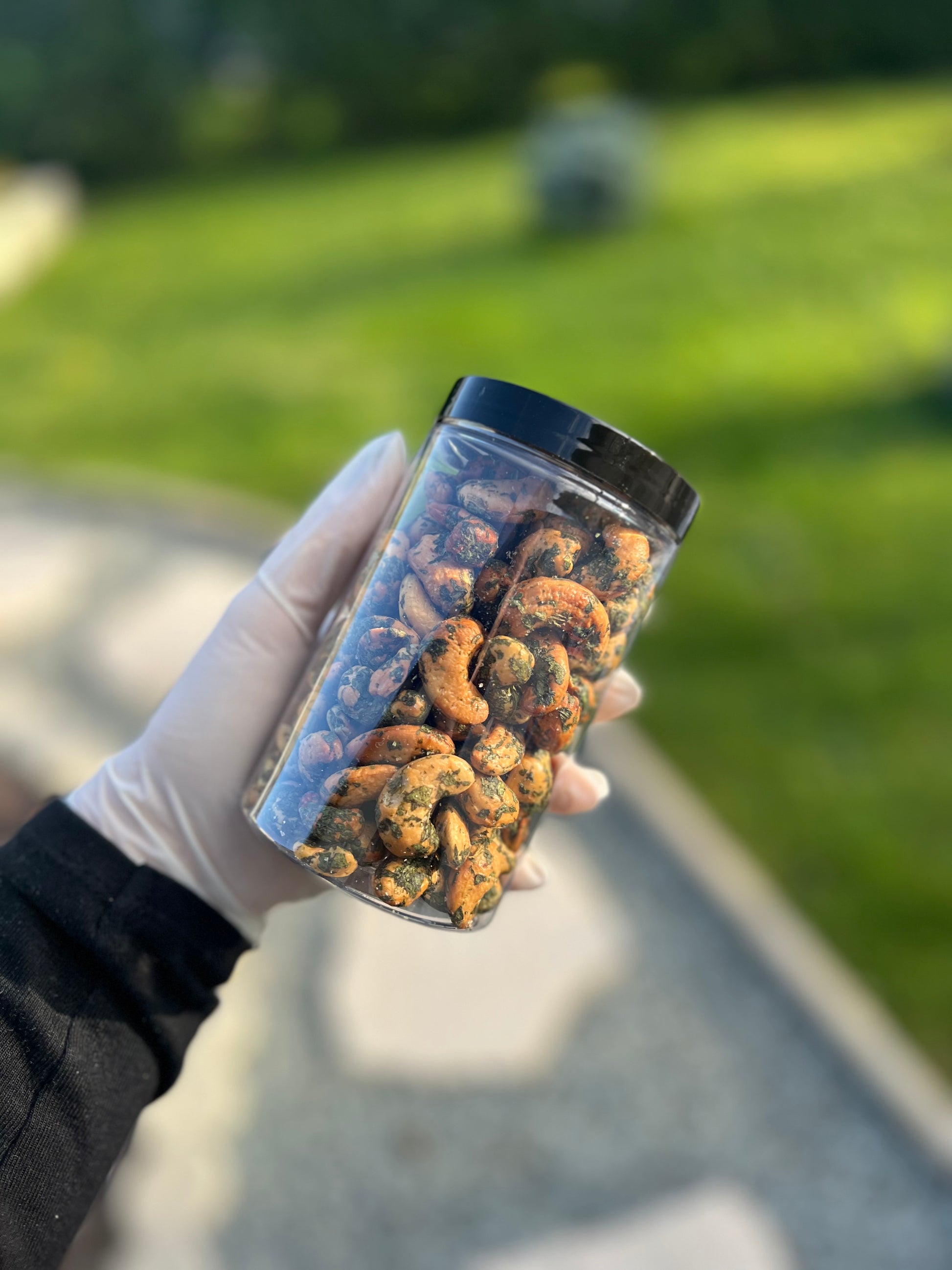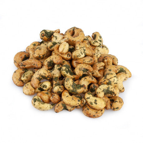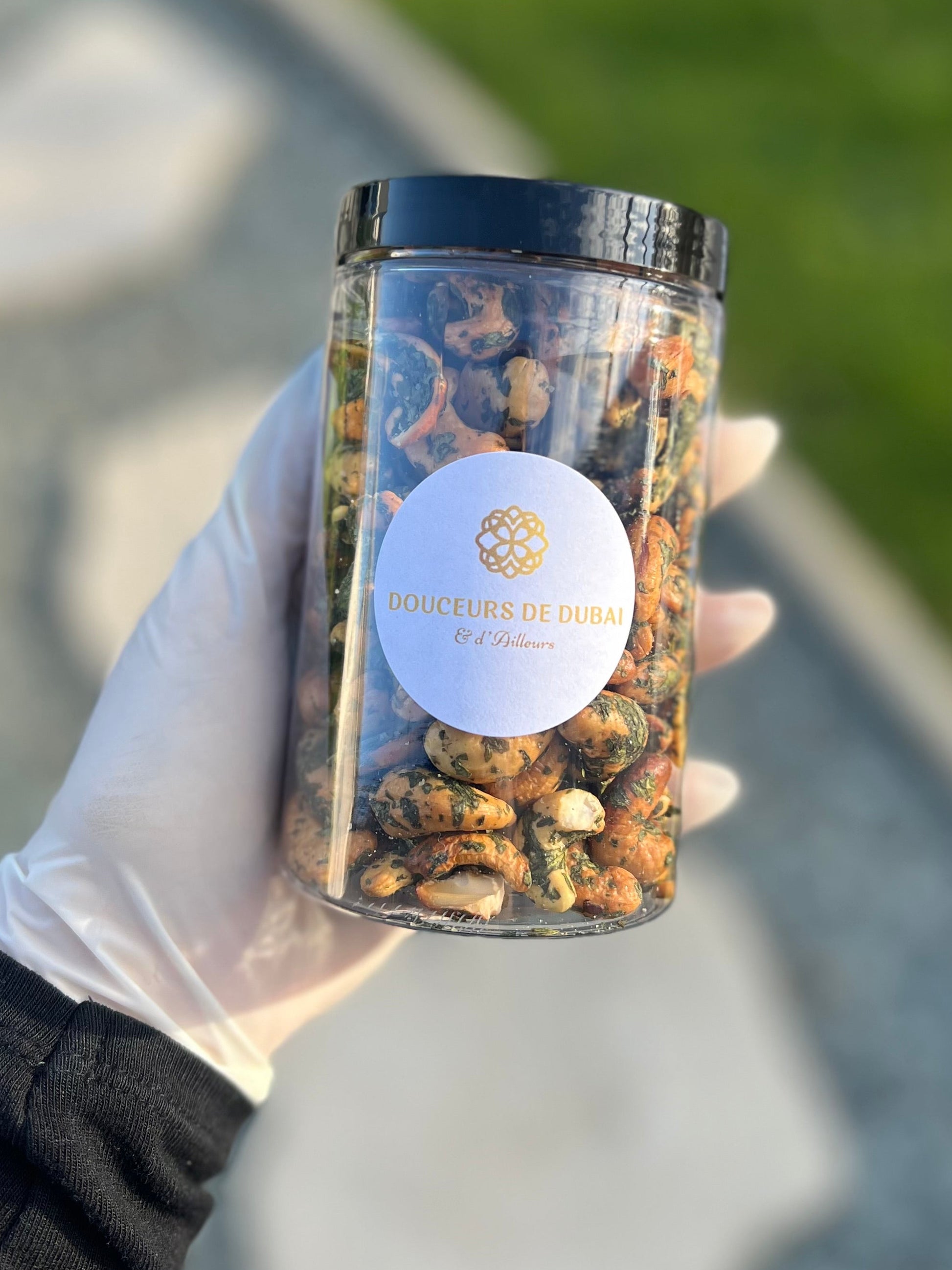 Ces noix de cajou délicatement torréfiées sont relevées par l’arôme subtil et végétal de l’ail des ours, une plante sauvage au goût finement aillé. Ensemble, elles forment une alliance équilibrée entre douceur et caractère.