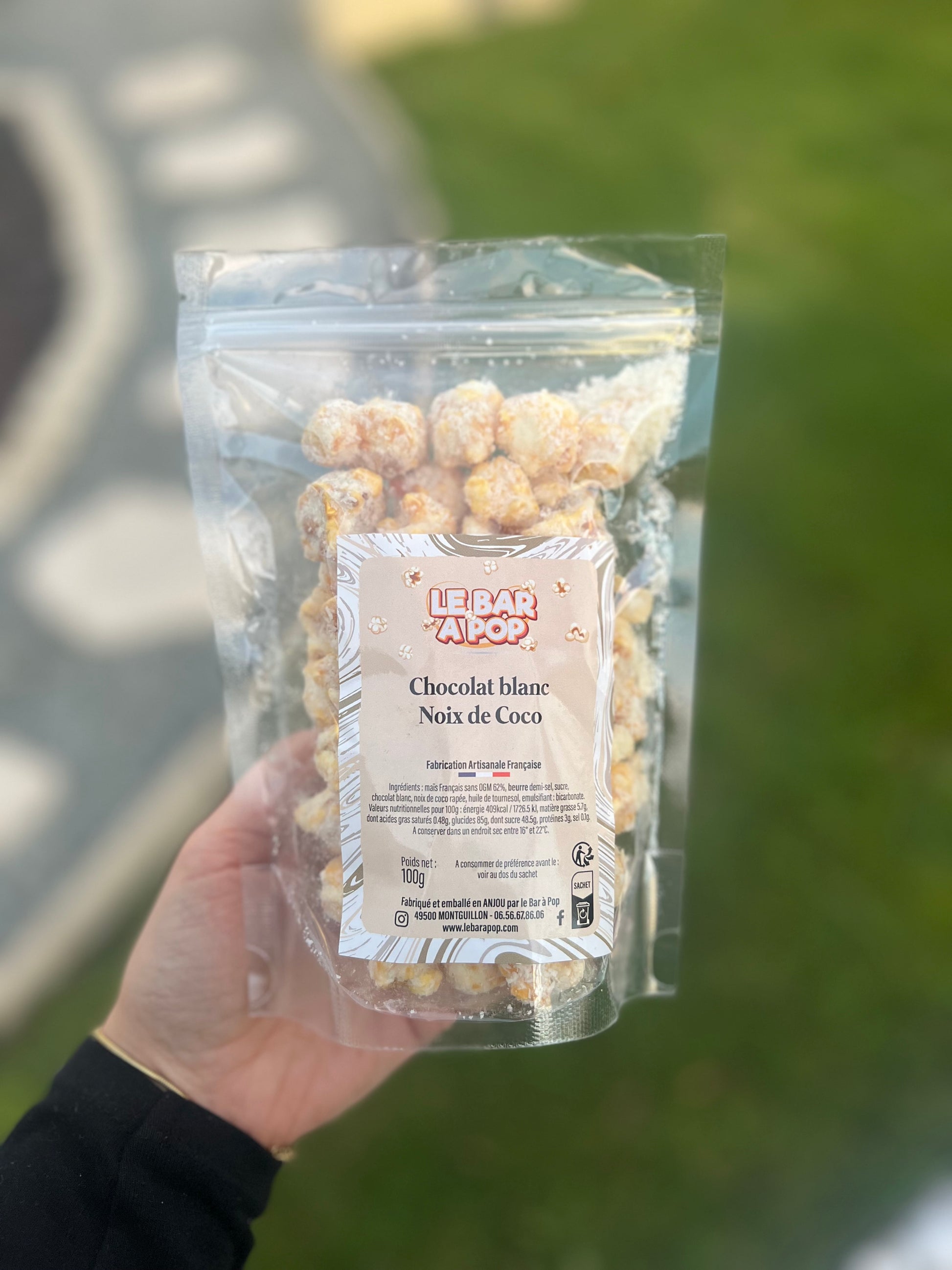 Nos pop-corns artisanaux croustillants sont délicatement enrobés d’un chocolat blanc onctueux, puis saupoudrés de noix de coco râpée pour une touche fondante et tropicale irrésistible.