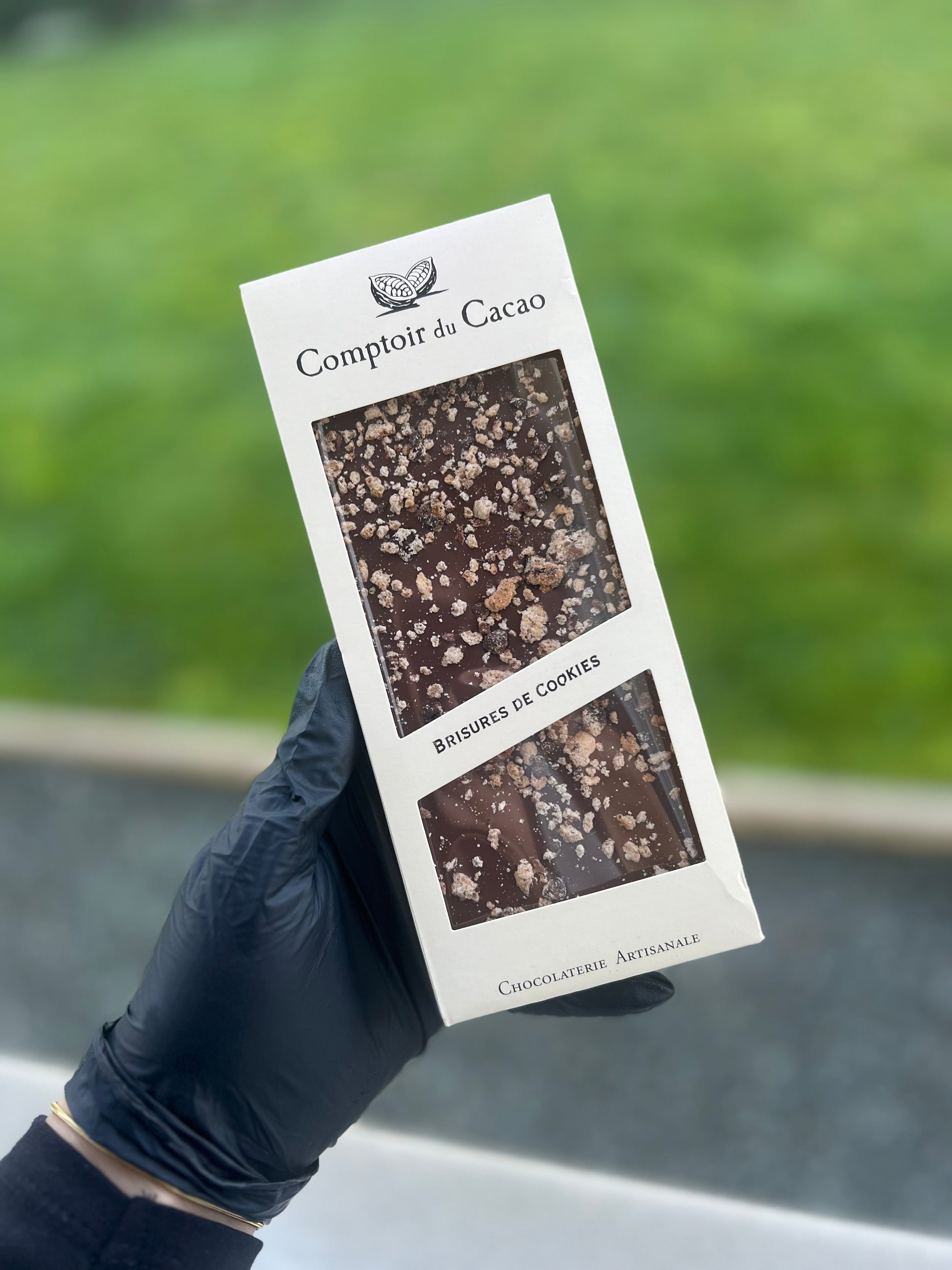 Cette tablette de chocolat au lait 38 % de cacao séduit par son goût lacté et gourmand, doux et fondant en bouche. Elle est agrémentée de morceaux de cookies (minimum 12 %), apportant un croquant irrésistible et une touche légèrement biscuitée qui se marie parfaitement avec le chocolat au lait.