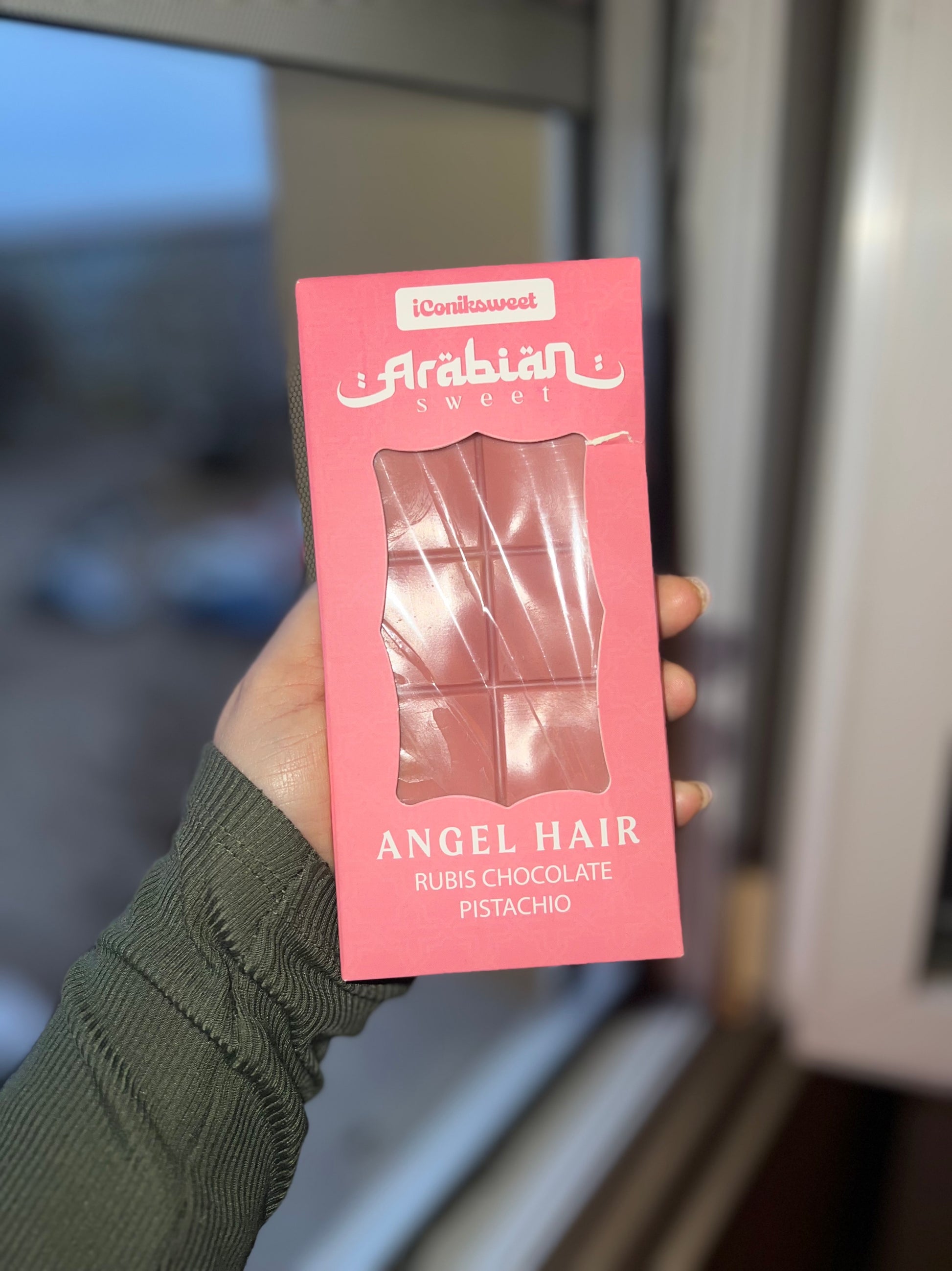 Ingrédients : Chocolat (beurre de cacao, sucre, masse de cacao, poudre de lait entier, lait en poudre écrémé, émulsifiant : lécithine de soja, arôme vanille), crème de pistache (pistache, sucre, huile de palme, protéine de lait, lait en poudre écrémé, émulsifiant : lécithine de soja, colorants : E102, E133), pâte de kunafa (farine, sucre, fécule de maïs, huile végétale, sel).